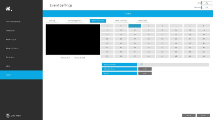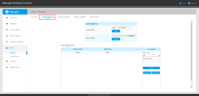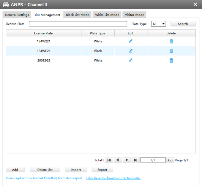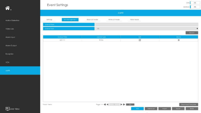 Add the license plates to this interface as Black or White type (Black/White List), and then you can set the alarm action for these license plates in the corresponding black list mode or white list mode interface. When these license plates are detected, the camera will respond to your settings accordingly.