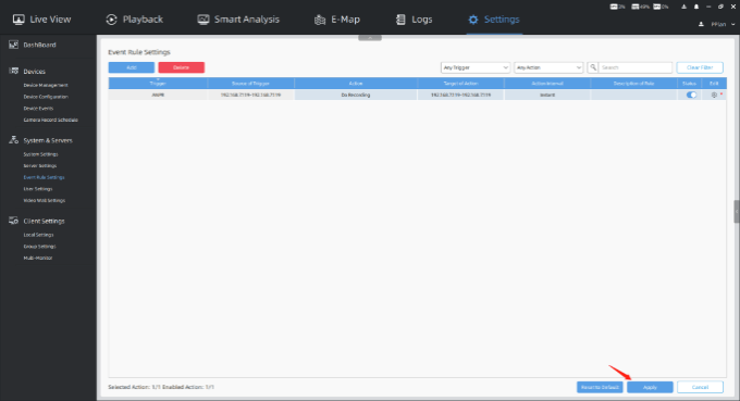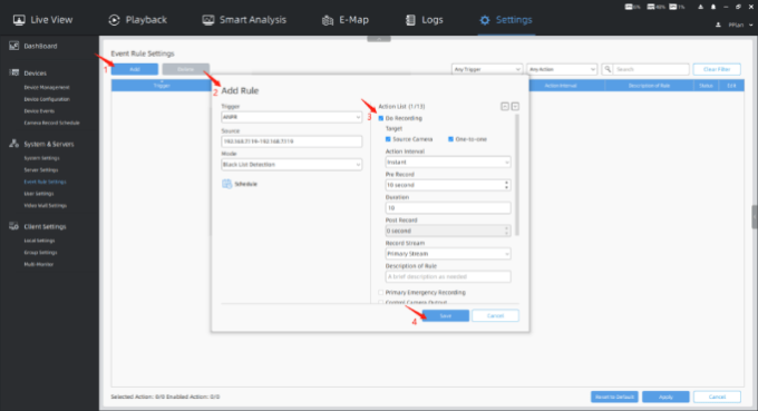 Step2: Then select the trigger type as ANPR, set the source of trigger, and select the detection mode as your demand. And set the schedule and the Do Recording action. After setting the event rules, click
