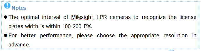 • The optimal interval of Milesight LPR cameras to recognize license plates width is within 100-200 PX.