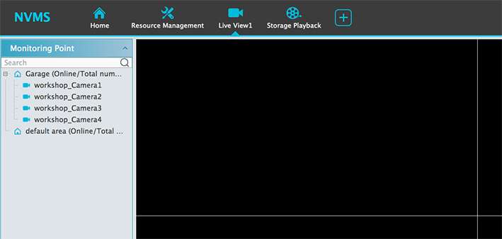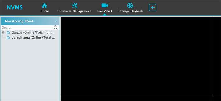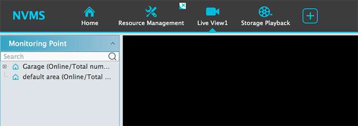 Clicking on the “Live View” tab across the top will now allow you to view your cameras but the camera layout will need to be populated first. On the left of the screen under “Monitoring Point” you will notice the default area and if you created a custom area that will also be listed there. A small “+” symbol will be to the left of the title to signify that area has some cameras assigned to it and can be expanded by clicking.