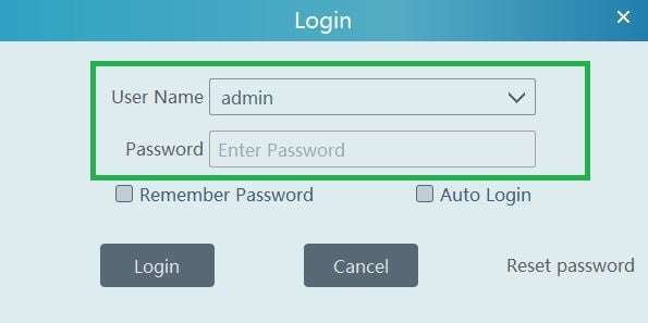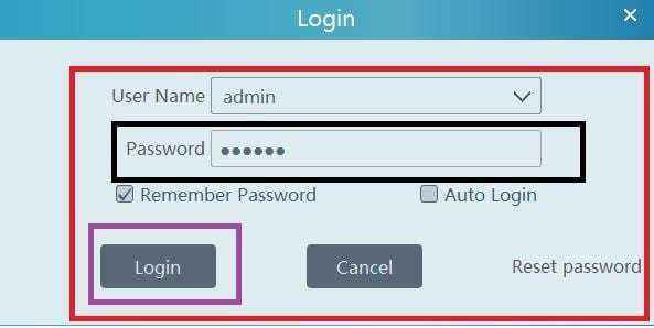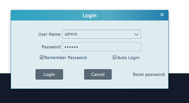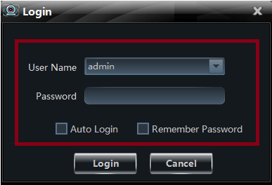 When the NVMS software starts you will be presented with the login dialog the default login details will be username: admin and password: 123456.