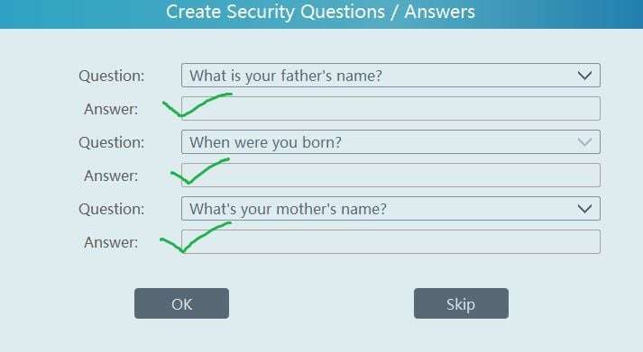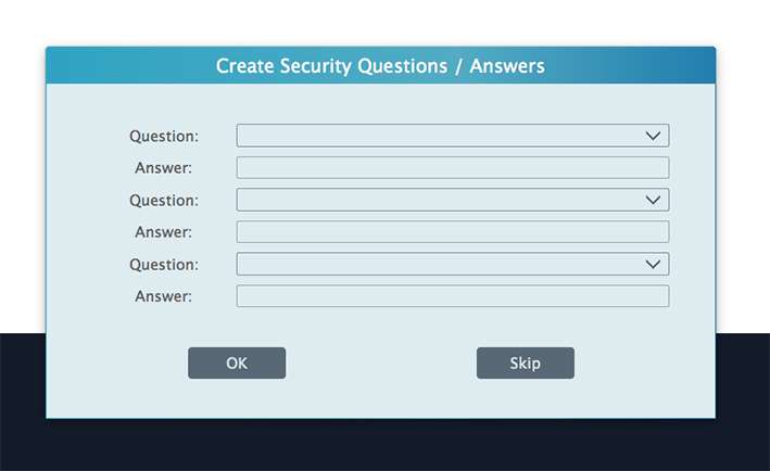 Next you will be presented with the option to create security question and answers or you can leave them blank and skip past this.