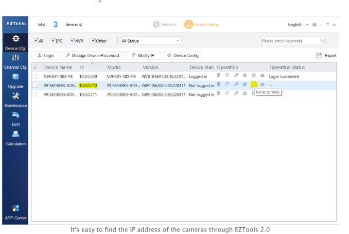 Another way to perform a firmware upgrade is via the web interface of the camera. To access the web interface of the camera, use EZTools 2.0 to find the local IP of the camera and enter it in your web browser. Or, you can click the “Remote Web” icon to automatically open the camera in your default browser.