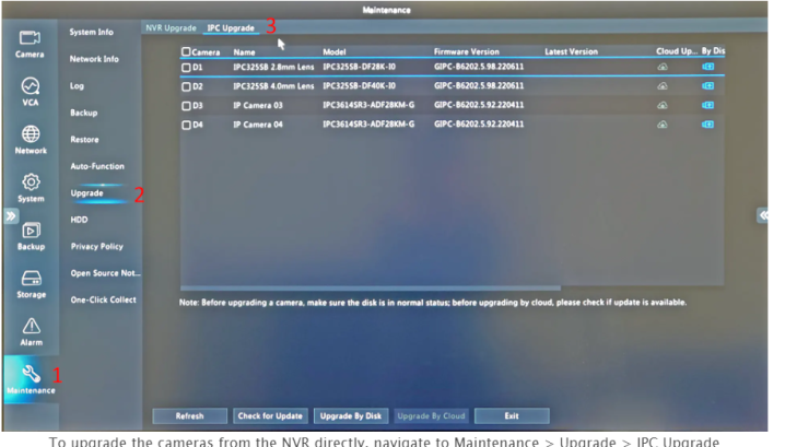 Using a USB mouse connected to the NVR, right-click to open the menu and select “Main Menu”. Navigate to Maintenance -> Upgrade -> IPC Upgrade for a list of all cameras added to the NVR. Click “Check for Update” at the bottom for the NVR to search Uniview’s servers for the latest firmware version for your cameras. Next, select the cameras you’d like to upgrade by checking the box on the left side. Finally, click “Upgrade by Cloud” and hit “OK” to upgrade the selected cameras firmware.