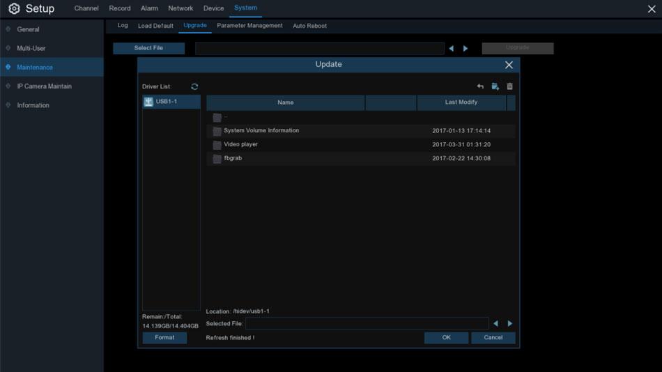Click on ‘Select File’ and find the firmware update file on your memory stick, then click ‘OK’. Click ‘Upgrade’ to start the process which will take 5-10 minutes; do not turn off the NVR or remove the memory stick during this time.