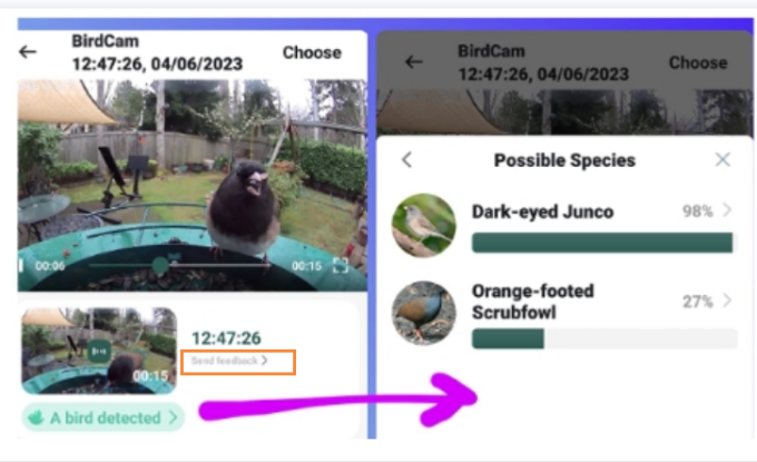 5. Choose one bird video. Click on “A bird detected” (blue bird icon) to view the bird’s name.