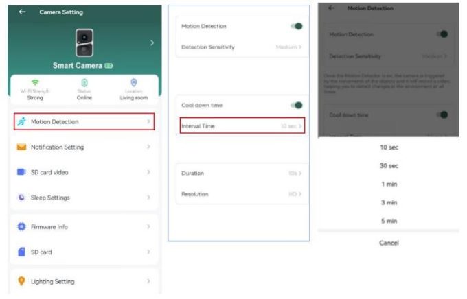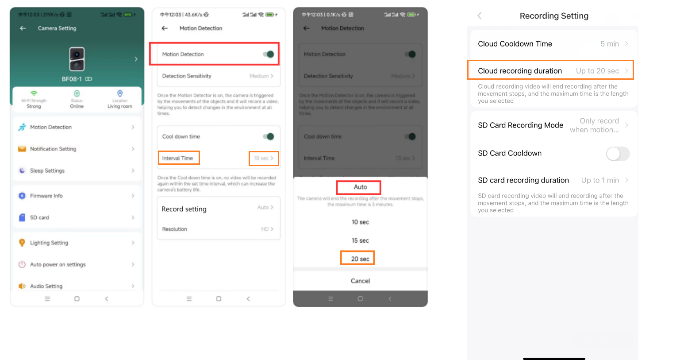 ② You can turn on/off the Cool down time.(You can set the cool down time to reduce the trigger frequency and set the interval time as 10s, 30s, 1min, 3min, 5min as you want)③ You can set the video record time as auto,10,15, and 20 seconds. Auto:The recording time will be different from 5 seconds to 3 minutes according to the motion activated time length.But when you choose Auto,the battery will consume more power. It is suggested to be default as 10 seconds to optimize the battery power saving.