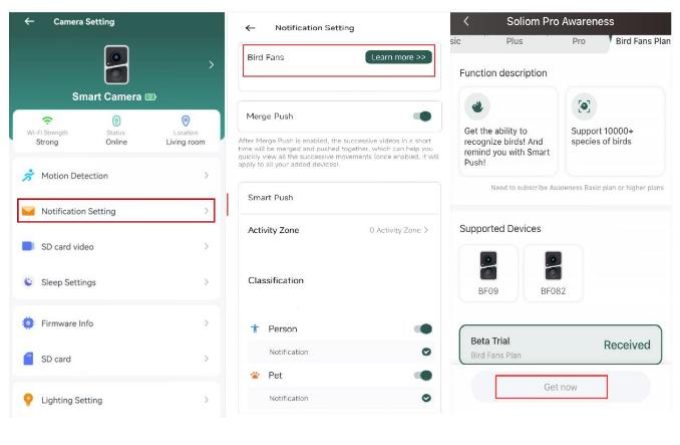 Activity Zone, Smart Push and Bird fans plan features require at least the basic paid cloud service plan.