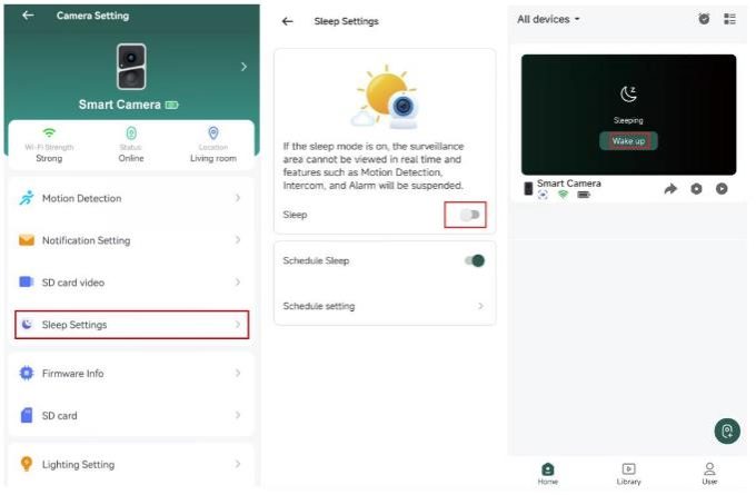 ① If the sleep mode is on, the surveillance area cannot be viewed in real time and features such as Motion Detection. intercom, and Alarm will be suspended.