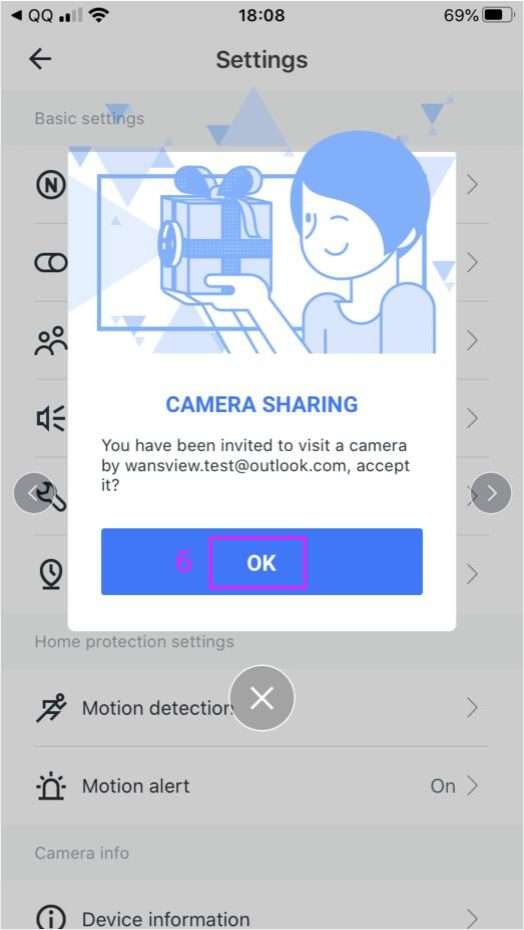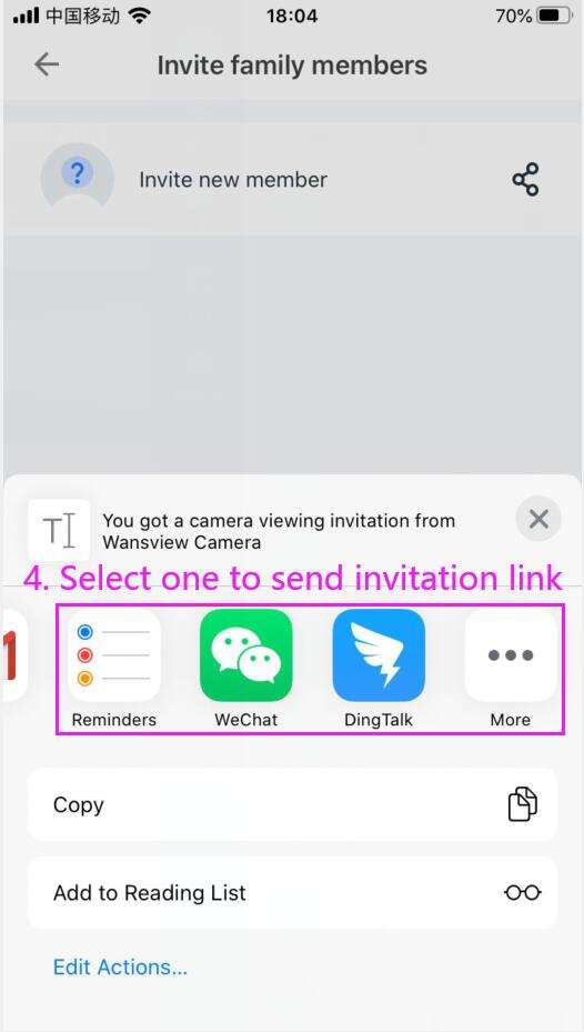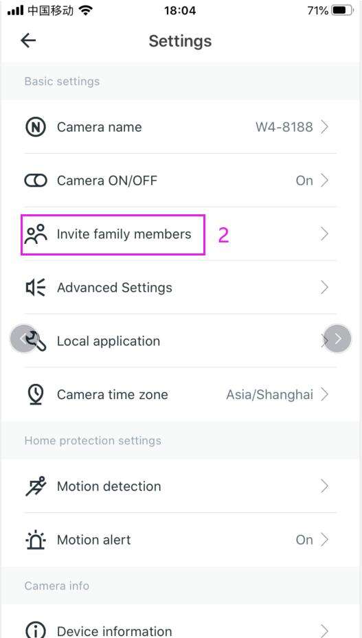 When the camera is online, tap . Setting-Invite family members, then click . to invite new member