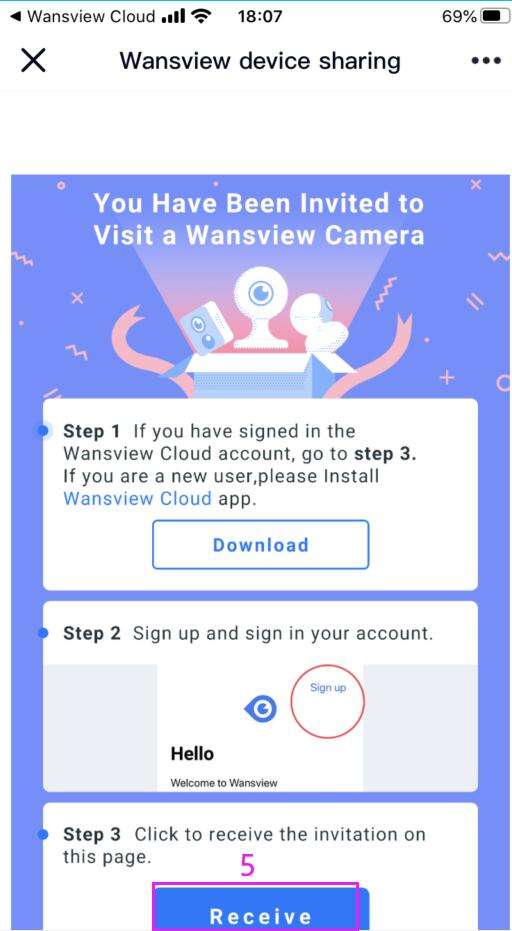 Open the link the sharer sent, then click “Receive” and “OK” to receive the shared camera.