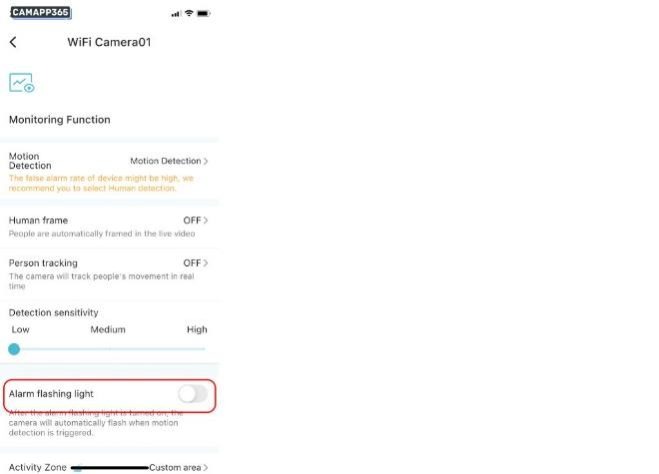 After the alarm flashing light is turned on, the camera will automatically flash when motion detection is triggered.
