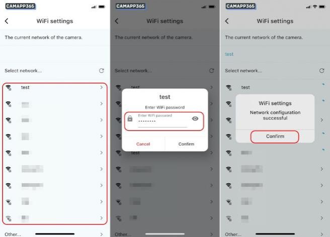 3. Select your wifi, then enter your wifi password, click Confirm and wait for O-KAM Pro camera to connect to your wifi.