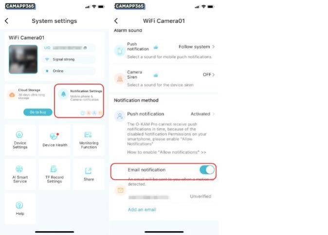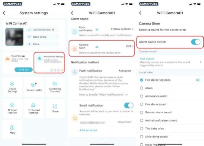 Enter Notification Settings, select Camera Siren and then turn on the Alarm sound switch.