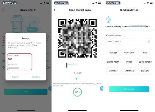 5. Make sure your wifi is 2.4g and the wifi password is correct, then click Confirm. Give the displayed QR code to the camera to scan.