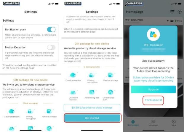The app will prompt you to subscribe, it is recommended to cancel, if you need cloud storage, make sure the O-KAM Pro camera can work properly before subscribing.