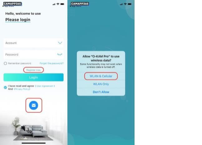 You need to register and login to O-KAM Pro APP to connect the camera, click Register now or email icon to register.
