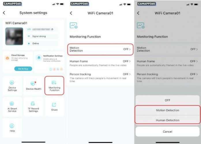 Activate the Motion Detection function in the Monitoring Function, O-KAM Pro cameras support Motion Detection and Human Detection.