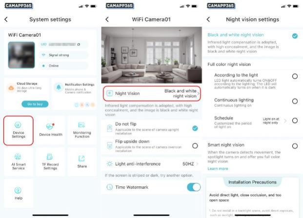 O-KAM Pro camera defaults to black and white night vision mode, you can change the night vision mode in Device Settings, Night Vision.