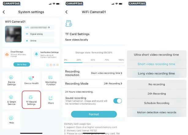 O-KAM Pro camera supports cloud storage and memory card recording, cloud storage requires subscription, the following memory card recording settings.