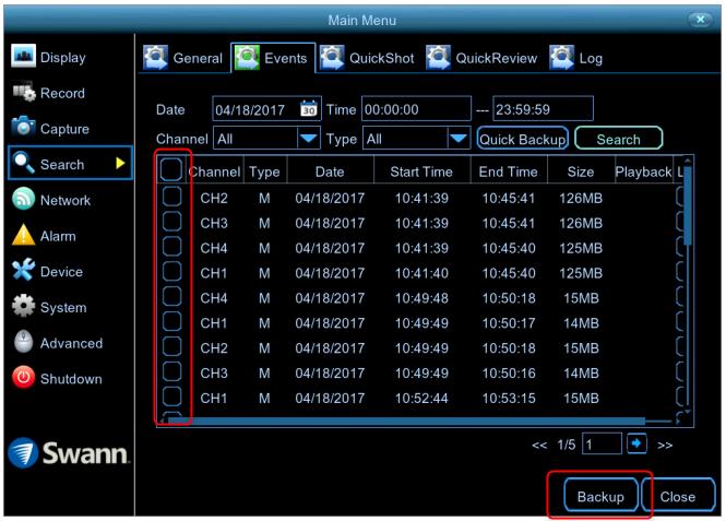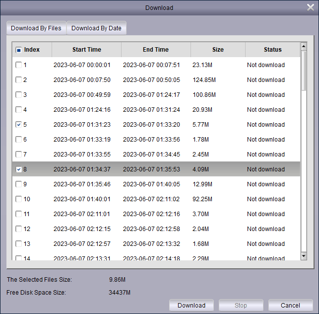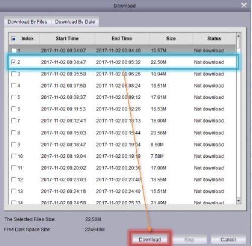 2. Select a file – it will then show you a list of files for that day on the selected camera. Select the recordings you want to download by putting a tick or a check next to it.
