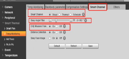 Set the Snap Angle Filter and set the face angle to an appropriate threshold. If there are many high-temperature environments in the background, it is recommended to set the reference value to 20. At the same time, turning on the “Only Measure Forehead Temp” function can effectively reduce the false alarm caused by the background high temperature.