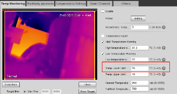Changed the Temp Lower Limit lower from 32ºC to 25ºC. (The factory default value is 32ºC).In order to avoid the situation that the camera does not detect or detects less.